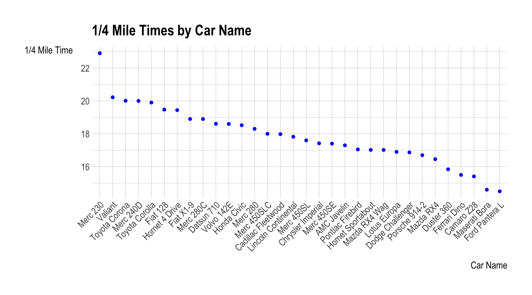 labs(title = "1/4 Mile Times by Car Name",