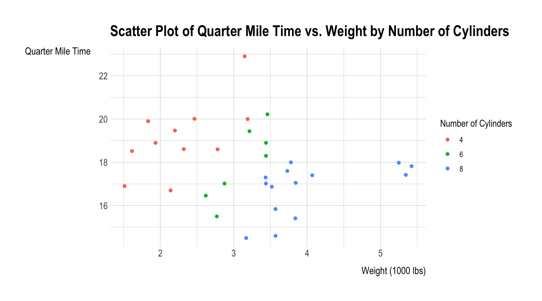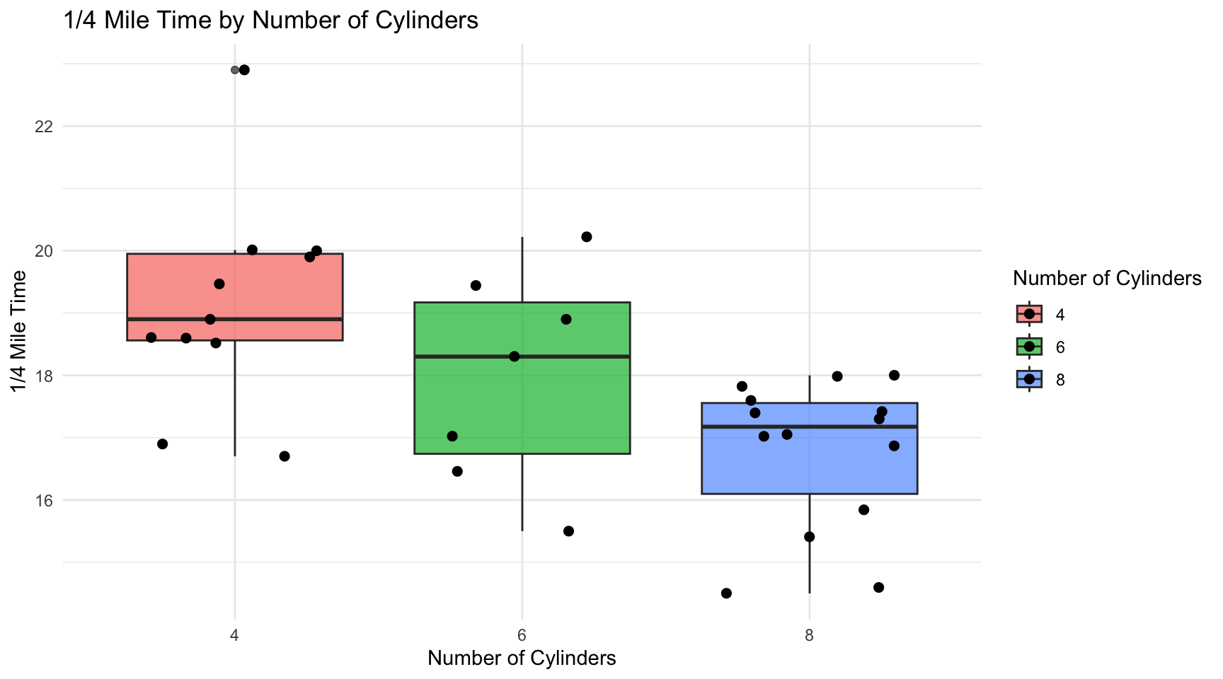 This graph allows you to visually see the difference in quarter mile time and how it varies by the number of cylinders in the vehicle. As you can see the vehicles with fewer cylinders can generally be seen with a slower quarter mile time.