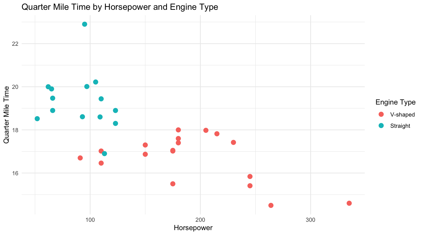 labs(title = "Quarter Mile Time by Horsepower and Engine Type",