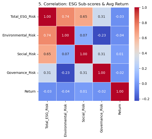 Interpretation: In the 5×5 correlation matrix, you’ll see that Environmental_Risk has the most noticeable modest negative correlation with average return, while Social_Risk and Governance_Risk hover near zero correlation. Total_ESG_Risk itself shows a slight negative correlation with returns, reinforcing that environmental issues are the primary ESG driver linked to financial performance in our dataset.