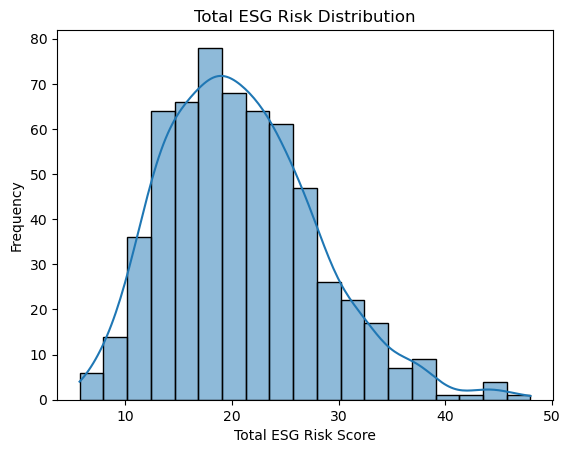 Total ESG Risk sits, on average, in the mid-teens to low-twenties, with a median very close to the mean—so most companies cluster around that moderate-risk level. The 25th–75th interquartile range tells you that half of firms fall within a relatively narrow band, but the full min-to-max span shows a handful of very low-risk and very high-risk outliers.