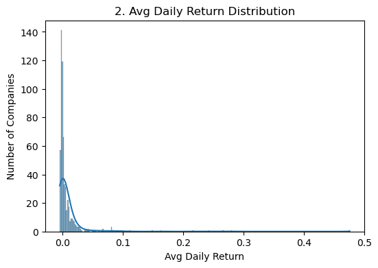 # 2) Distribution of Average Daily Return per Companyplt.figure(figsize=(6,4))sns.histplot(company_df['Return'], kde=True)plt.title('2. Avg Daily Return Distribution')plt.xlabel('Avg Daily Return')plt.ylabel('Number of Companies')plt.show()
