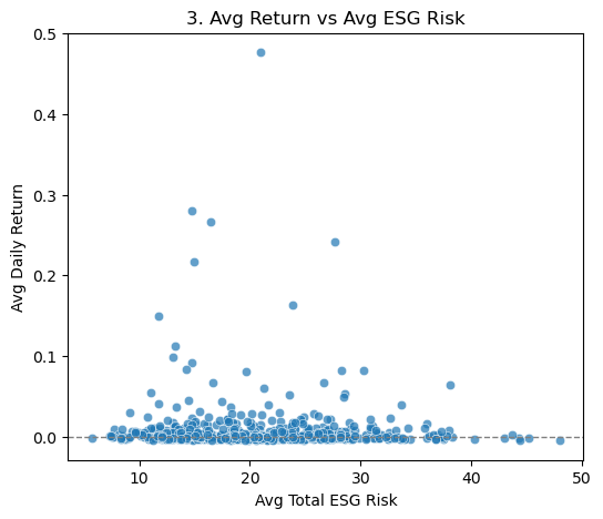 # 3) Scatterplot: Avg Return vs Avg Total ESG Riskplt.figure(figsize=(6,5))sns.scatterplot(x='Total_ESG_Risk', y='Return', data=company_df, alpha=0.7)plt.title('3. Avg Return vs Avg ESG Risk')plt.xlabel('Avg Total ESG Risk')plt.ylabel('Avg Daily Return')plt.axhline(0, color='gray', linestyle='--', linewidth=1)plt.show()