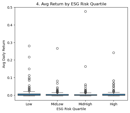 # 4) Boxplot of Avg Return by ESG Risk Quartilecompany_df['ESG_Quartile'] = pd.qcut(company_df['Total_ESG_Risk'], 4, labels=['Low','MidLow','MidHigh','High'])plt.figure(figsize=(6,5))sns.boxplot(x='ESG_Quartile', y='Return', data=company_df)plt.title('4. Avg Return by ESG Risk Quartile')plt.xlabel('ESG Risk Quartile')plt.ylabel('Avg Daily Return')plt.show()