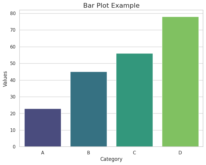 import seaborn as snsimport matplotlib.pyplot as pltimport pandas as pd# Sample datadata = {'Category': ['A', 'B', 'C', 'D'],'Values': [23, 45, 56, 78]}df = pd.DataFrame(data)# Create a barplotsns.set(style="whitegrid") # Optional: Set a clean grid styleplt.figure(figsize=(8, 6)) # Set the figure sizesns.barplot(data=df, x='Category', y='Values', palette='viridis')# Customize the plotplt.title("Bar Plot Example", fontsize=16)plt.xlabel("Category", fontsize=12)plt.ylabel("Values", fontsize=12)# Show the plotplt.show()
